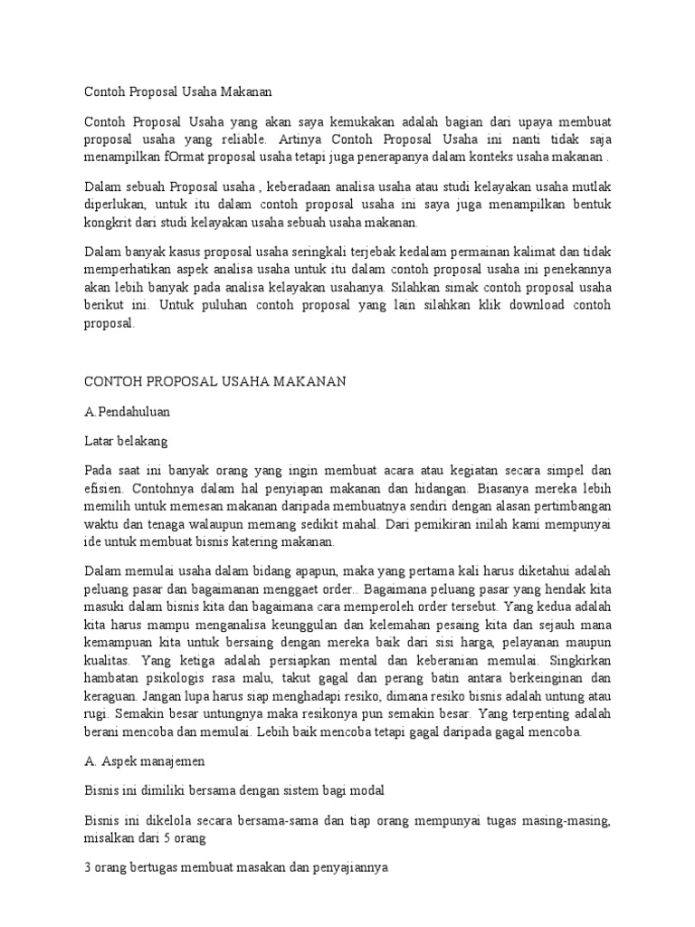 Contoh proposal usaha makanan (doc) download contoh proposal. Namun banyak juga yang masih buta, mereka harus mencari referensi contoh proposal untuk mereka tiru dan sesuaikan dengan kebutuhan mereka. Proposal bisnis ini layak untuk dibiayai karena dari sisi analisis pengembangan usaha serta peningkatan potensi usaha dapat lebih cepat untuk berkembang serta dari prospek keuangan cukup menguntungkan dan memiliki prosfek pasar yang baik. Mendapatkan surat pesanan barang bisa anda mulai dengan cara mengirimkan penawaran minuman. Contoh dan isi dari proposal ini adalah pengajuan kegiatan penelitan. Contoh proposal usaha makanan by posted on. Sehingga jika tidak terjual semua, bisa disimpan untuk waktu yang lain. Itulah sekilas tentang contoh proposal usaha yang bisa saya uraikan. Oleh karena itu pada kesempatan kali ini akan diulas tentang contoh proposal yang bisa dijadikan sebagai pembelajaran. Kebetulan pada artikel kali ini saya akan memberikan contohnya secara lengkap kepada kalian semua. Memang sangat perlu banget kalau kita mempunyai usaha di bidang makanan maka anda harus mempu membuat. Maka dari itu, anda harus mempelajari terdahulu mengenai contoh proposal yang sudah ada di cryptowi sebagai berikut. Penelitian, usaha makanan, kegiatan, skripsi, pengajuan dana, bisnis, kerjasama dan penawaran.